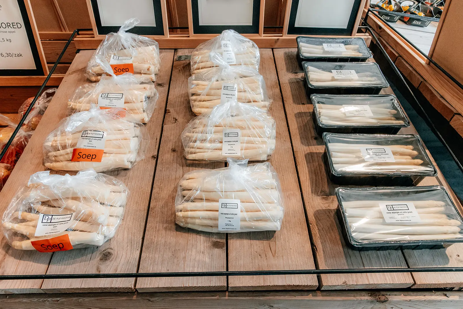 Onze asperges komen recht van het veld van De Pleynhoeve. Het witte goud haal je bij je favoriete Roes-winkel in het aspergeseizoen, van maart tot juni. Naar gelang de smaak van de asperges kan dit wijzigen.