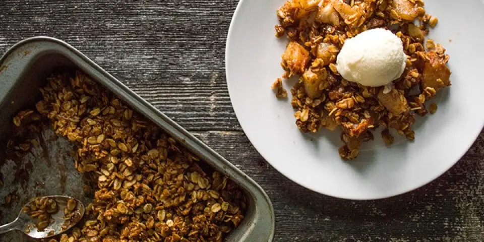 Appel met een knapperig-zoet kruimeldeeg en daar leg je een bolletje vanille ijs op.