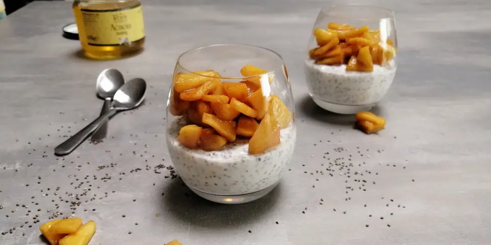 - Verdeel de gekarameliseerde appeltjes over de chiapudding. Smullen maar!