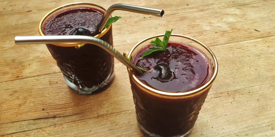 - Doe alle ingrediënten (behalve de muntblaadjes) in een stevige blender en mix.