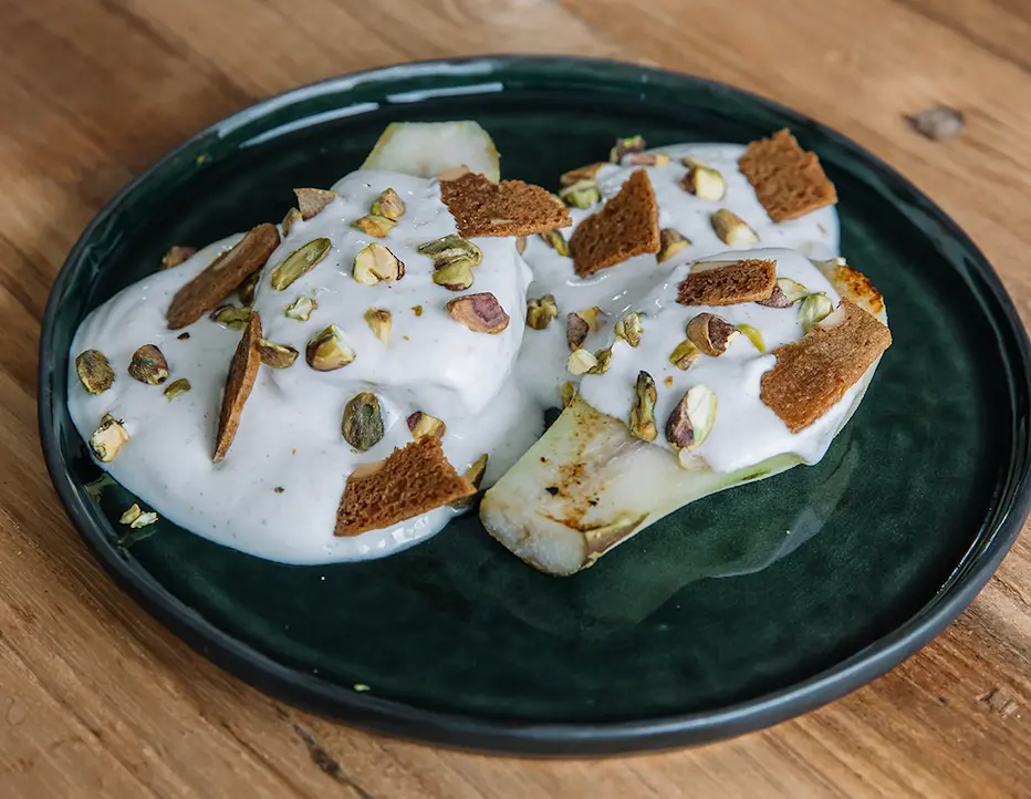 Verdeel de gegrilde halve peren over de borden, schep er een lepel yoghurt op, bestrooi met de pistachenoten en steek er een paar koekstukken in.
